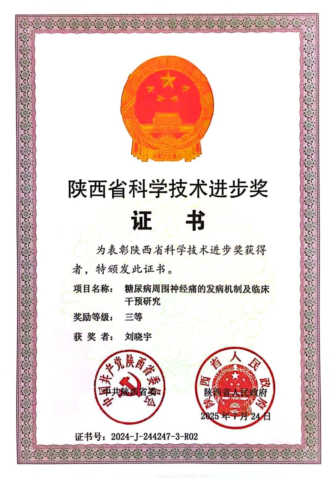 近日,我院刘晓宇专家团队联合空军第九八六医院内分泌科凭借“糖尿病周围神经痛的发病机制及临床干预研究”项目,在2024年度陕西省科学技术奖评选中脱颖而出,荣获陕西省科学技术进步奖三等奖,这是我院在医学科研领域的又一重要突破,标志着我院在糖尿病周围神经病变诊疗研究方面逐步建立起显著的技术优势。